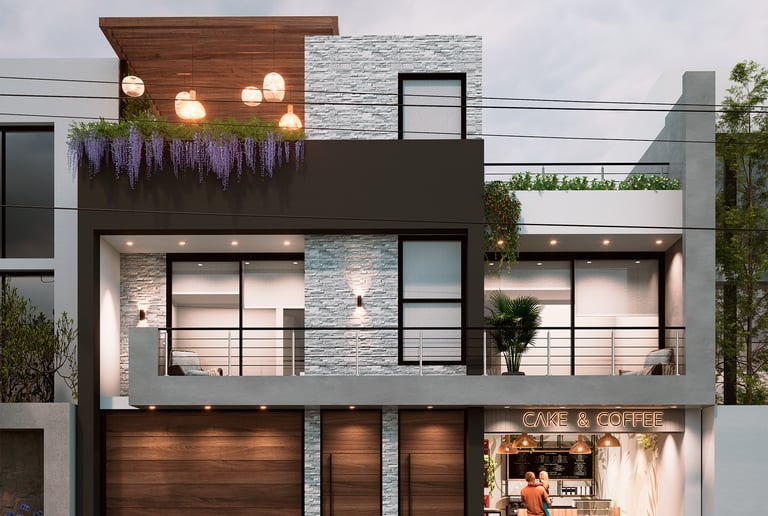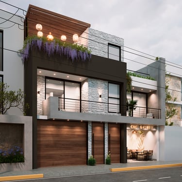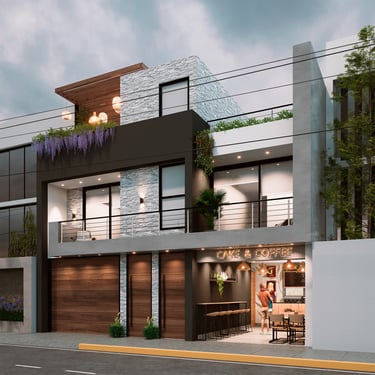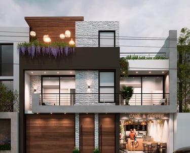 DESCRIPCIÓN: A pedido del cliente, el proyecto busca fusionar el uso residencial con el comercial, como respuesta al potencial económico y las necesidades de su entorno. Se plantea un local comercial que pueda ser usado por el mismo cliente, o en su defecto, alquilarlo a un tercero, esto es importante para determinar los accesos. Además, este primer nivel también contempla espacios sociales y de servicio con vista hacia un amplio patio posterior; mientras que en el segundo nivel, se ubican los dormitorios y un estar familiar. Desde la acera, se puede acceder a la azotea mediante un acceso independiente, la cual funcionará también como un espacio comercial que podrá ser alquilado.