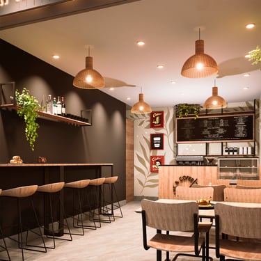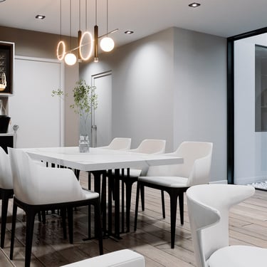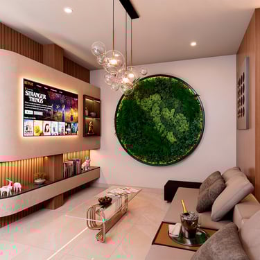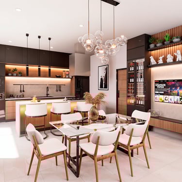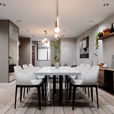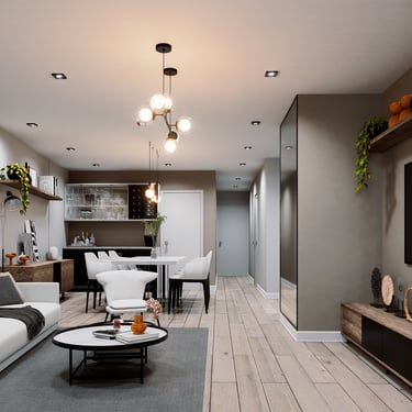La propuesta interior de la vivienda busca transmitir serenidad y glamur, Por ello, se plantea el uso de melamina castaño y negro grafito de alto brillo en mueblería, mientras que para revestimientos se emplea un vinil marmoleado adhesivo. Asimismo, para reforzar el concepto minimalista, se emplea pintura látex blanca en cielo raso y paredes, pero que contrasta con tonos grises. Por otro lado, se propone un piso SPC maderado de formato renctangular lo que le da un toque cálido y moderno. En la terraza, se busca un crear un espacio más rústico y acogedor que se refuerza con una iluminación cálida, perfecto para el disfrute de los inquilinos del multifamiliar.