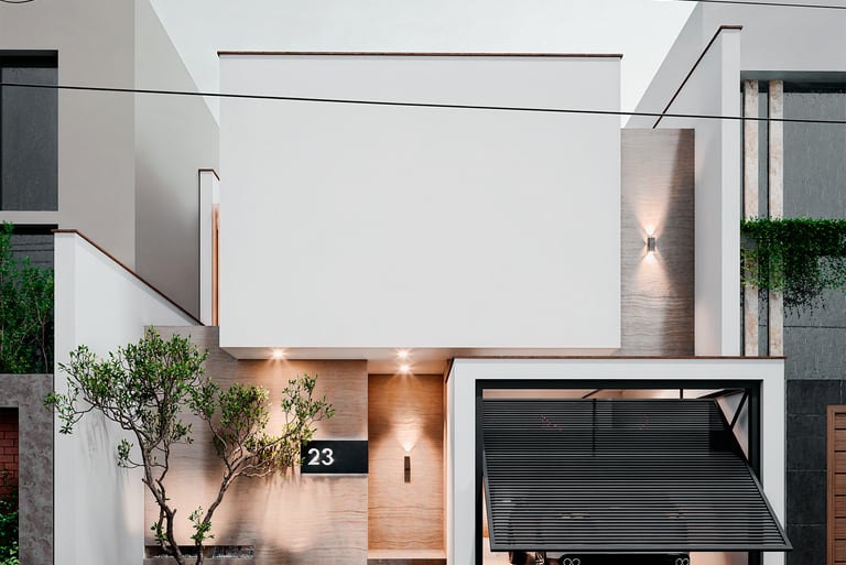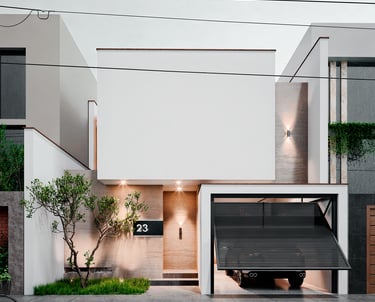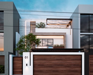 DESCRIPCIÓN: El proyecto se plantea en un contexto urbano frente a un parque, por lo que se busca aprovechar al máximo las visuales hacia este entorno natural, pero sin descuidar la seguridad que conlleva, por ello se propone el uso de ventanales en dormitorios y áreas de contemplación como la terraza. El concepto también desea otorgar ligereza y pureza a la composición volumétrica por lo que en ella se destaca el uso del blanco como acabado en muros, en contraste con la madera en un tono oscuro y el verde de la vegetación que resalta por encima del cerco en un primer plano, y para reforzar la idea, se acompaña con una iluminación cálida.