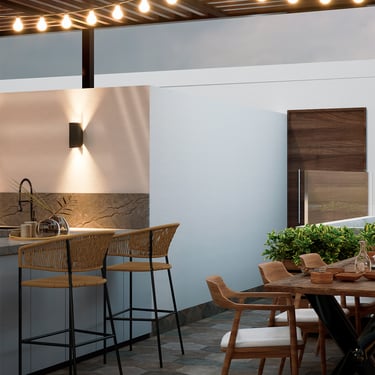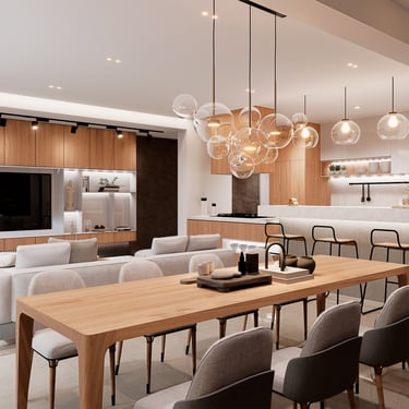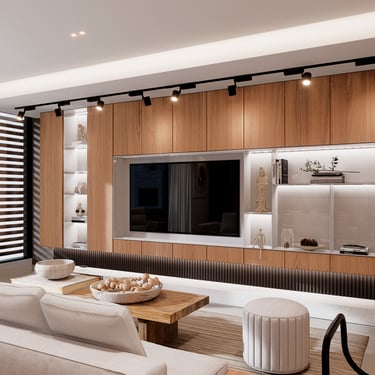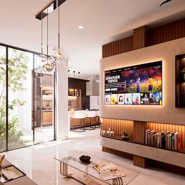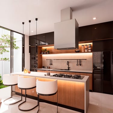 Por otro lado, al interior se propone crear espacios que inspiren tranquilidad, contemplación y relajación a quienes los habitan. Para lograrlo, se apuesta por la melamina castaño y el negro grafito de alto brillo, presentes en muebles y revestimientos que combinan elegancia y modernidad. Adicionalmente, se refuerza con el uso de pintura látex blanca en techos y paredes, generando una atmósfera limpia y luminosa. El toque final lo aporta un piso de porcelanato marmoleado en beige, en un elegante formato rectangular que amplifica la sensación de amplitud.